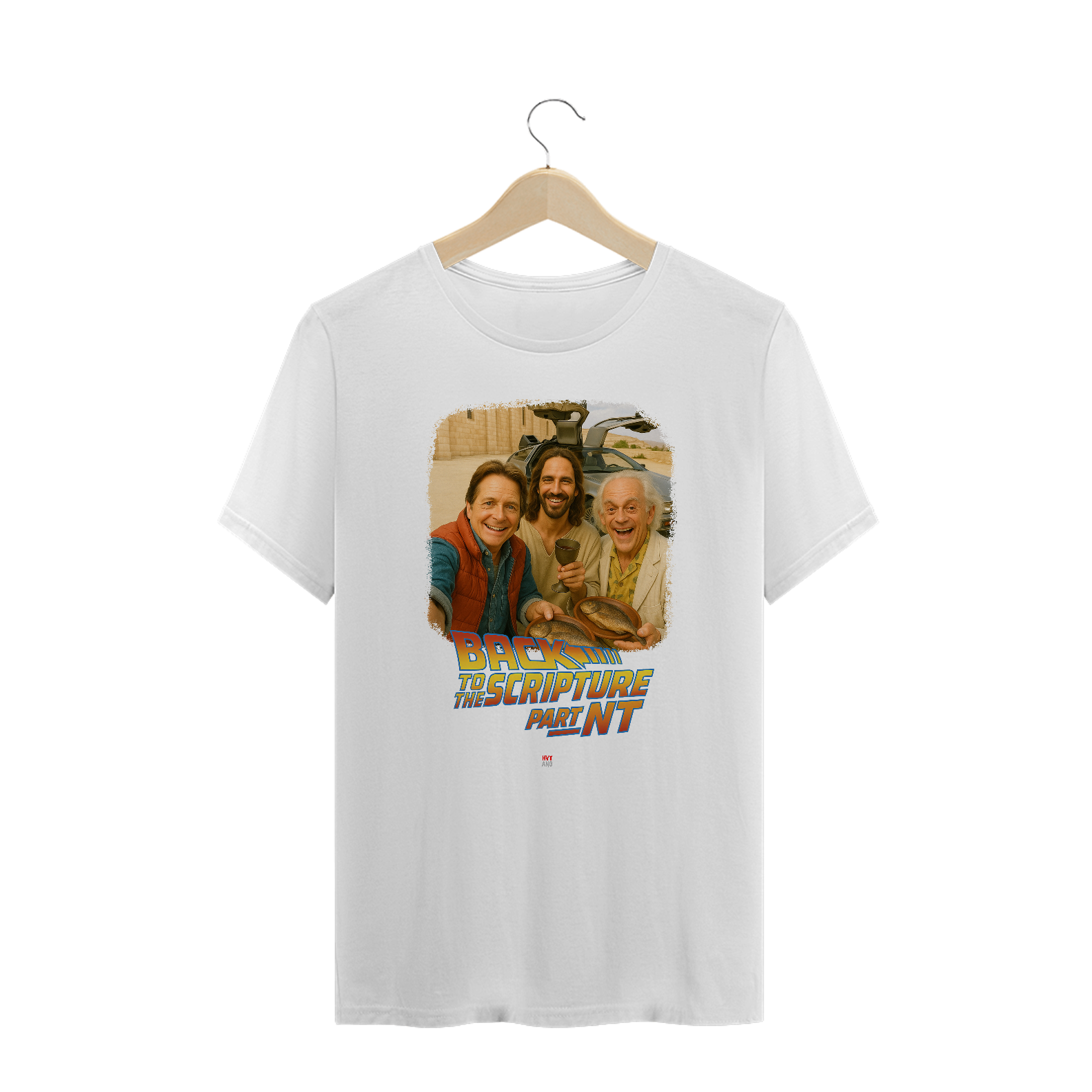 A HeavyAngélico apresenta essa estampa criativa e provocadora, unindo uma referência direta a um dos filmes mais icônicos da cultura pop com o chamado mais urgente da fé cristã: voltar para as Escrituras. A cena recriada traz Jesus ao lado dos personagens clássicos, segurando o pão e o cálice — apontando para a Nova Aliança.
