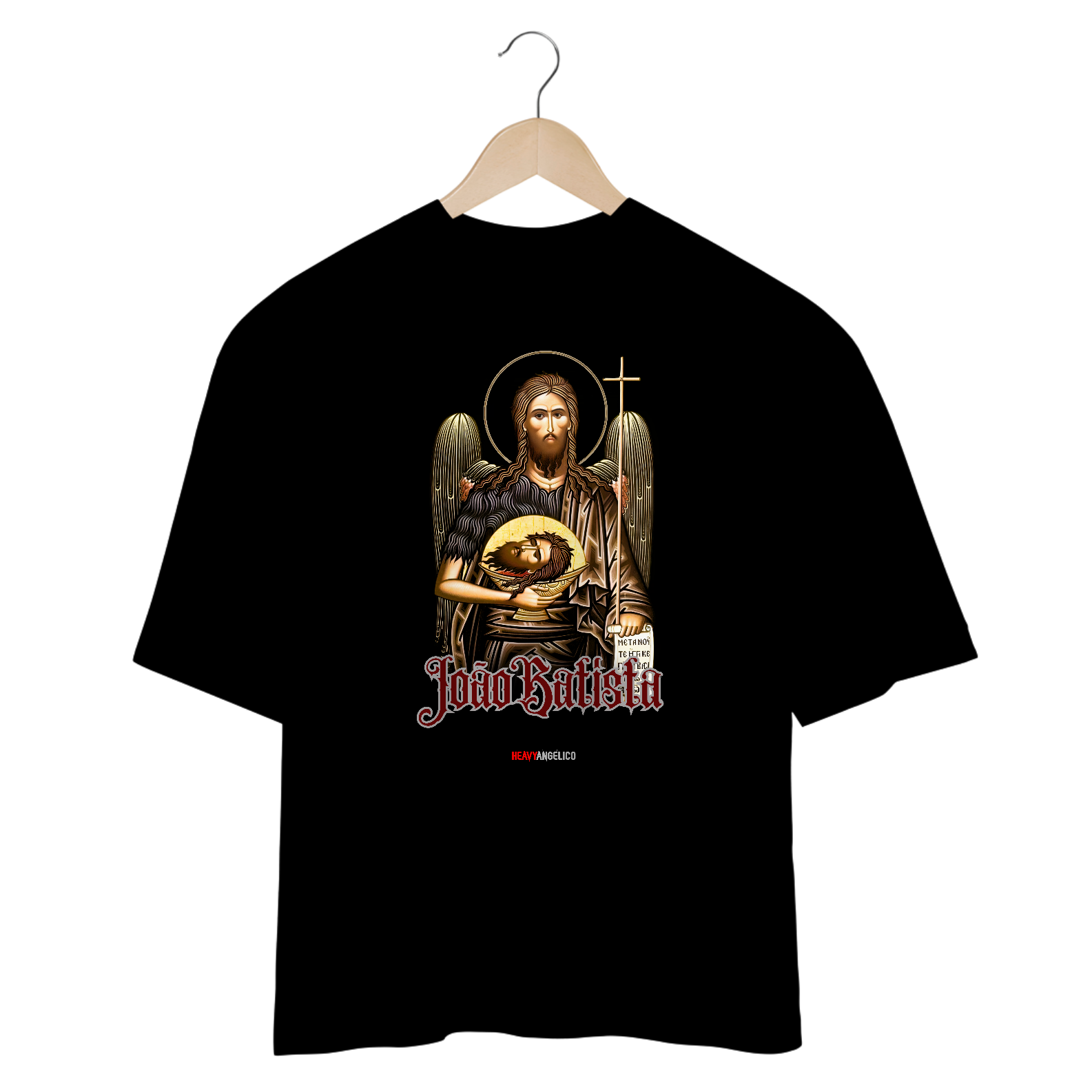 Vista sua fé com atitude e impacto! Esta estampa poderosa da HeavyAngélico retrata João Batista segurando sua própria cabeça no prato – uma simbologia marcante de sua missão cumprida e sua recompensa eterna ao lado de Jesus. Mais do que uma camisa, é uma declaração: viver para o propósito de Deus é um chamado que transcende até mesmo o sacrifício.