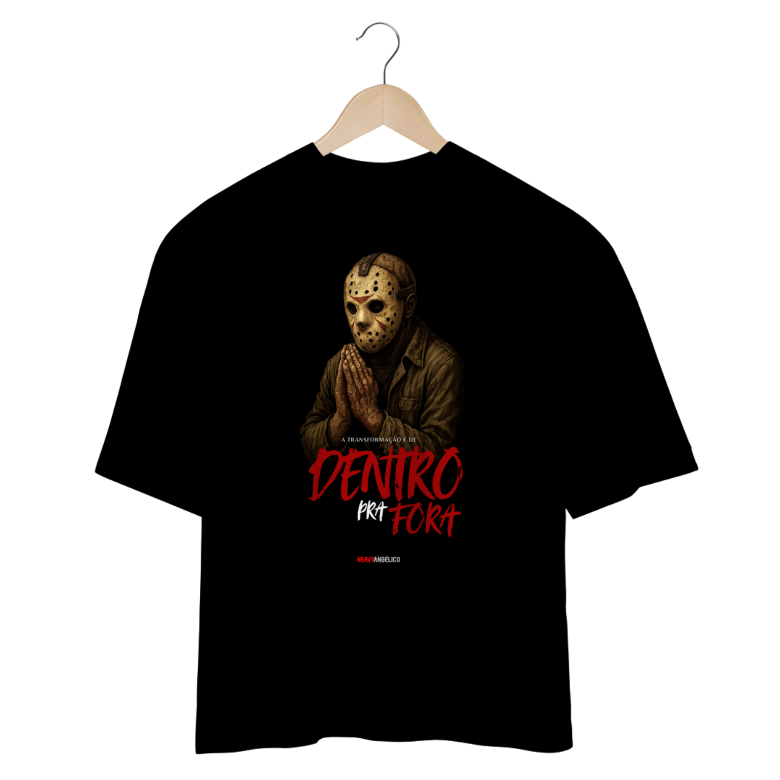 Nesta estampa criativa e provocativa da HeavyAngélico, um ícone do terror surge em um momento inesperado: em oração. A frase “A transformação é de dentro pra fora” quebra estereótipos e lança uma verdade bíblica poderosa — Deus não olha a aparência, Ele transforma o coração.