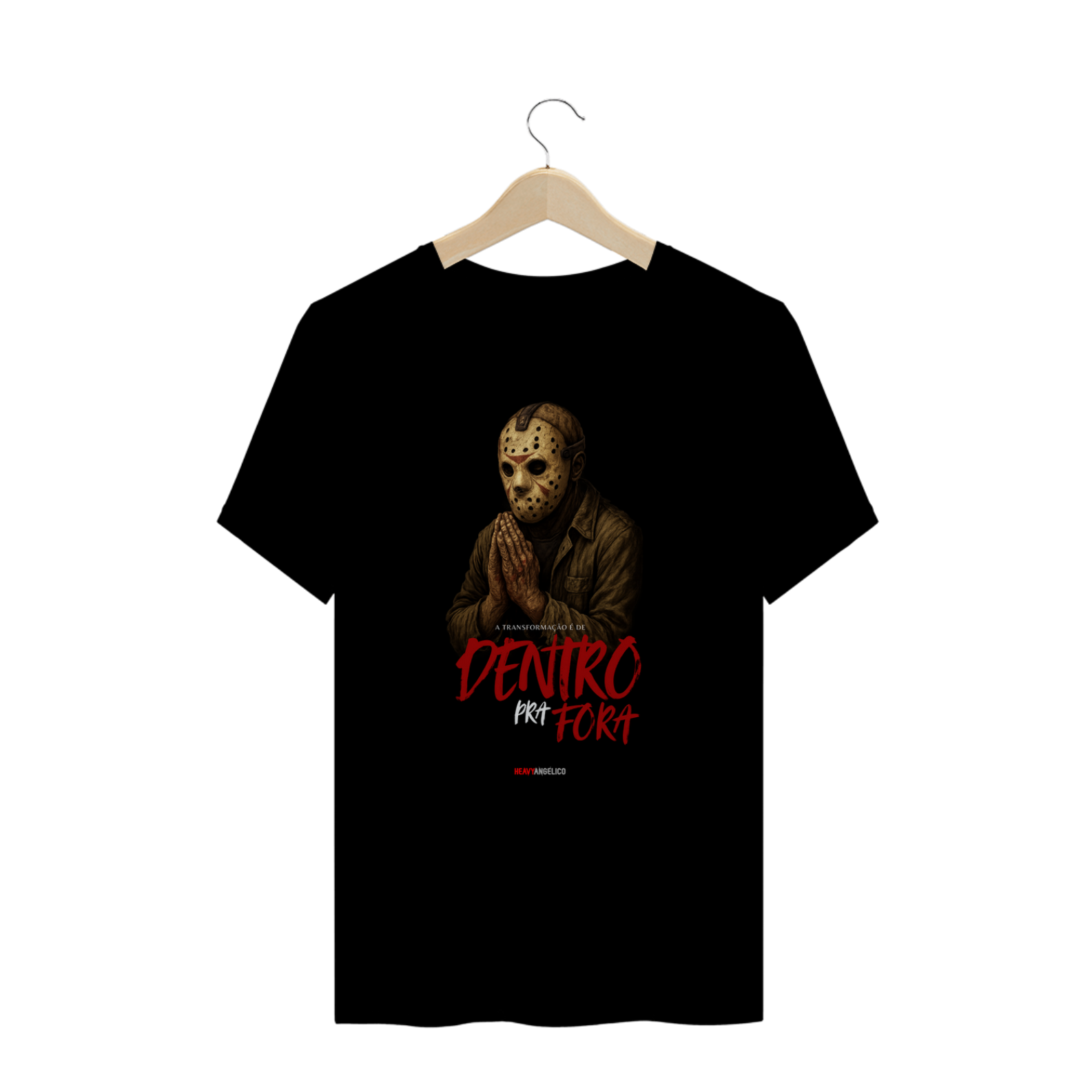Nesta estampa criativa e provocativa da HeavyAngélico, um ícone do terror surge em um momento inesperado: em oração. A frase “A transformação é de dentro pra fora” quebra estereótipos e lança uma verdade bíblica poderosa — Deus não olha a aparência, Ele transforma o coração.