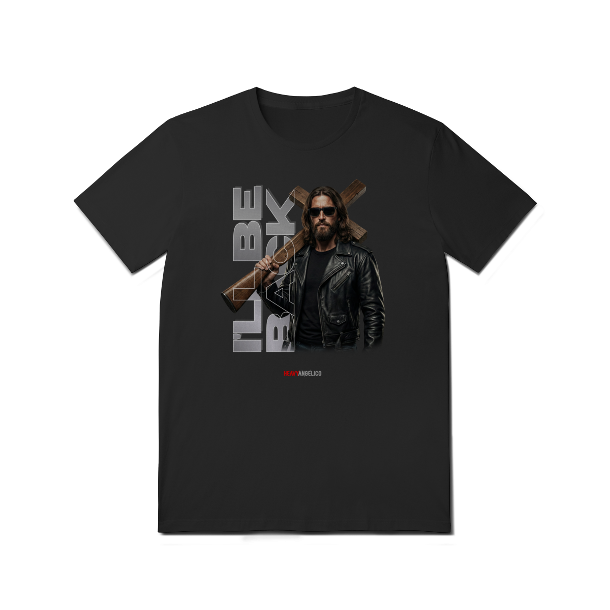 Na pegada do clássico “Exterminador do Futuro”, essa estampa traz uma releitura profética e visualmente brutal de Jesus: jaqueta de couro, óculos escuros, e a cruz nas costas — como quem diz: