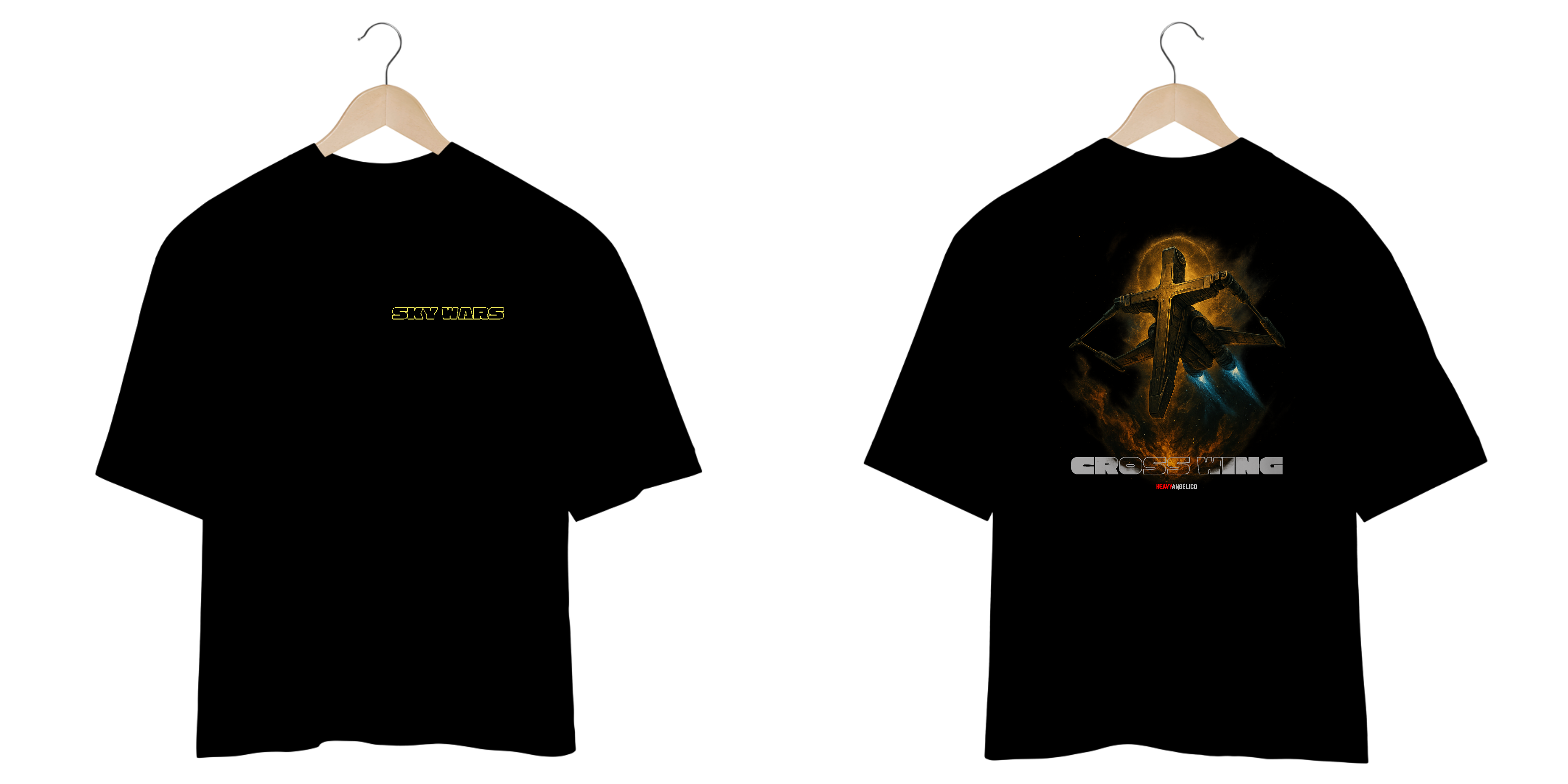 Nesta estampa de frente e verso, a HeavyAngélico eleva o conceito de guerra celestial com uma arte que funde ficção e verdade eterna. A famosa nave é agora reinterpretada com asas que formam uma cruz flamejante — porque a verdadeira vitória foi conquistada na cruz, e não em uma galáxia distante.